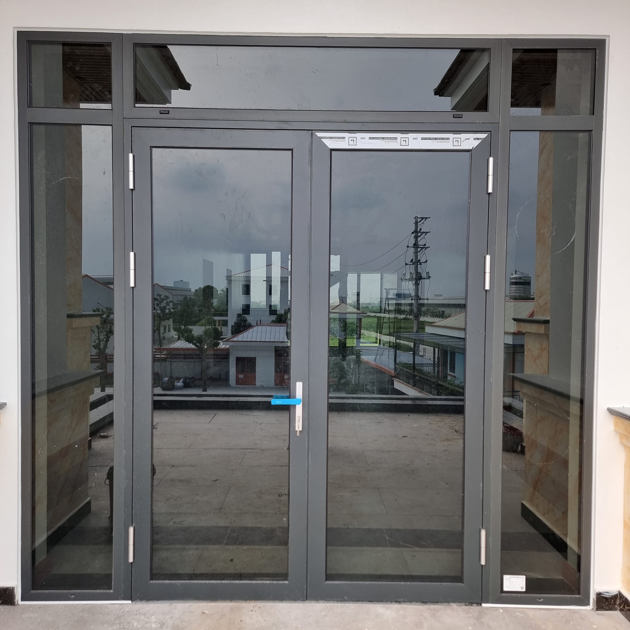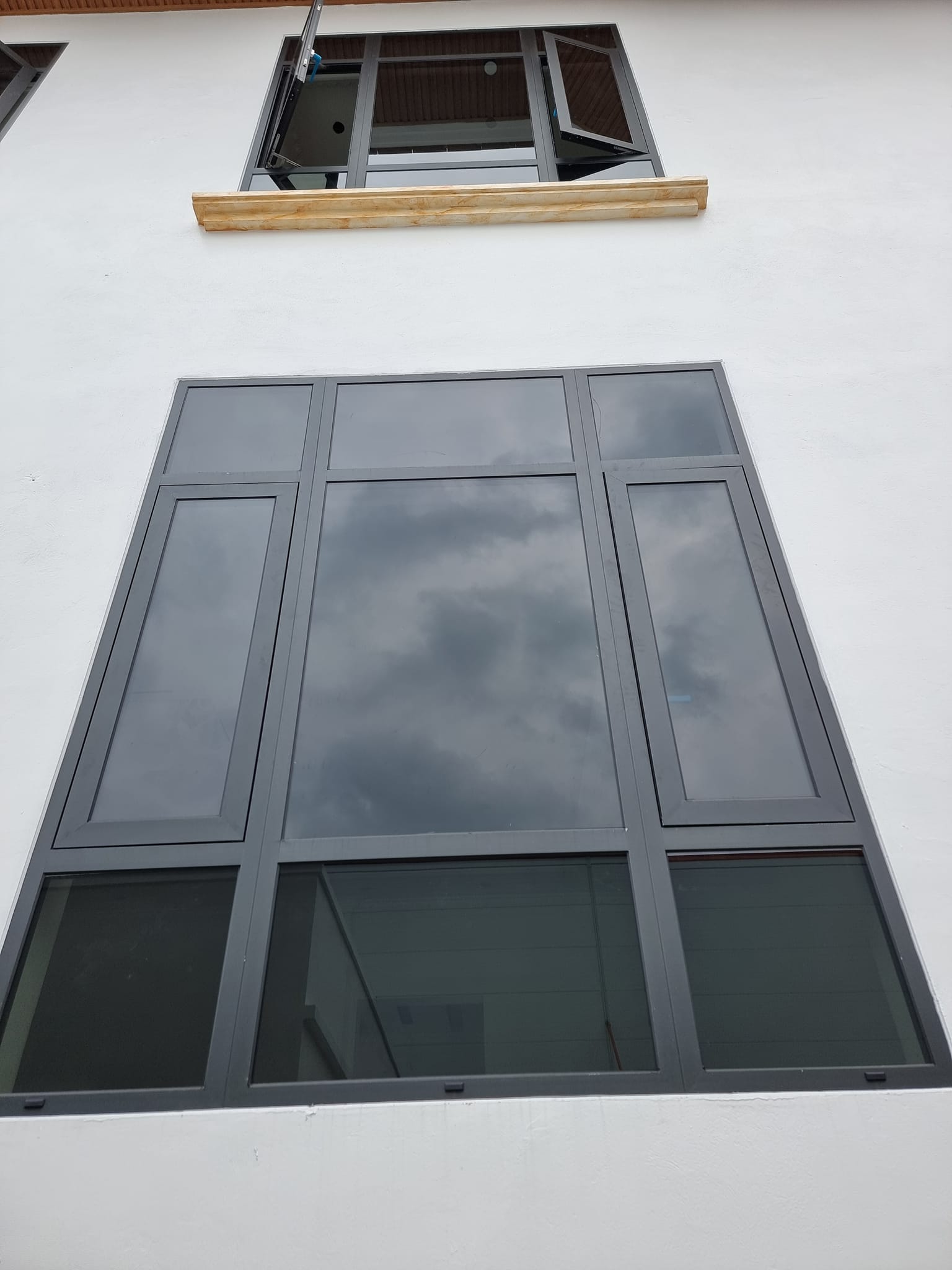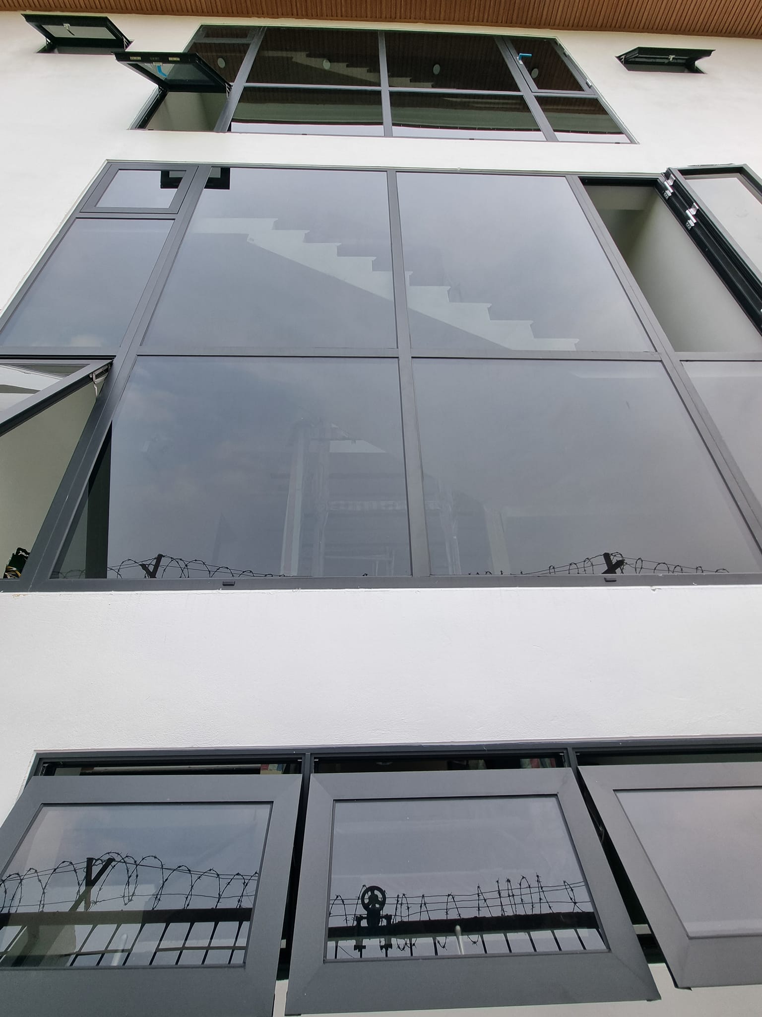 Toàn bộ công trình sử dụng nhôm Lumal Alumium cao cấp màu xám đá sần. Phụ kiện Skyline đồng bộ chính hãng. Kính sử dụng là kính an toàn 2 lớp 6.38mm Việt nhật Hải Long màu grey.