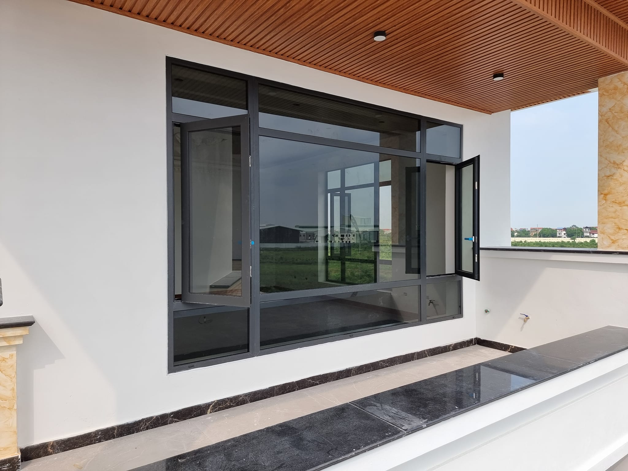 Đặc biệt với hệ thống nhôm kính được thiết kế rất tinh tế với cấu trúc nhiều cửa sổ kèm vách kính lớn để lấy tối đa ánh sáng và không khí tươi lưu thông vào nhà.